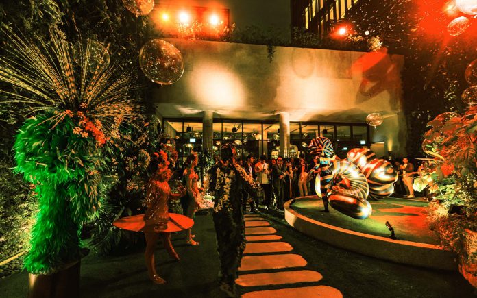 The party also showcased a series of striking installations – a sculptural waterfall adorned with vibrant tropical flora; and an Orange Grove Walkway that was lined with glowing oranges and twisting branches – as well as spontaneous art encounters.