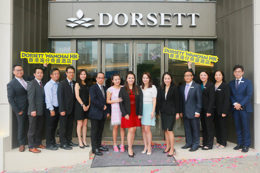 Winnie Chiu (center), president of Dorsett Hospitality International; Anita Chan (fifth from right), general Manager of Dorsett Wanchai Hong Kong; and hotel staff